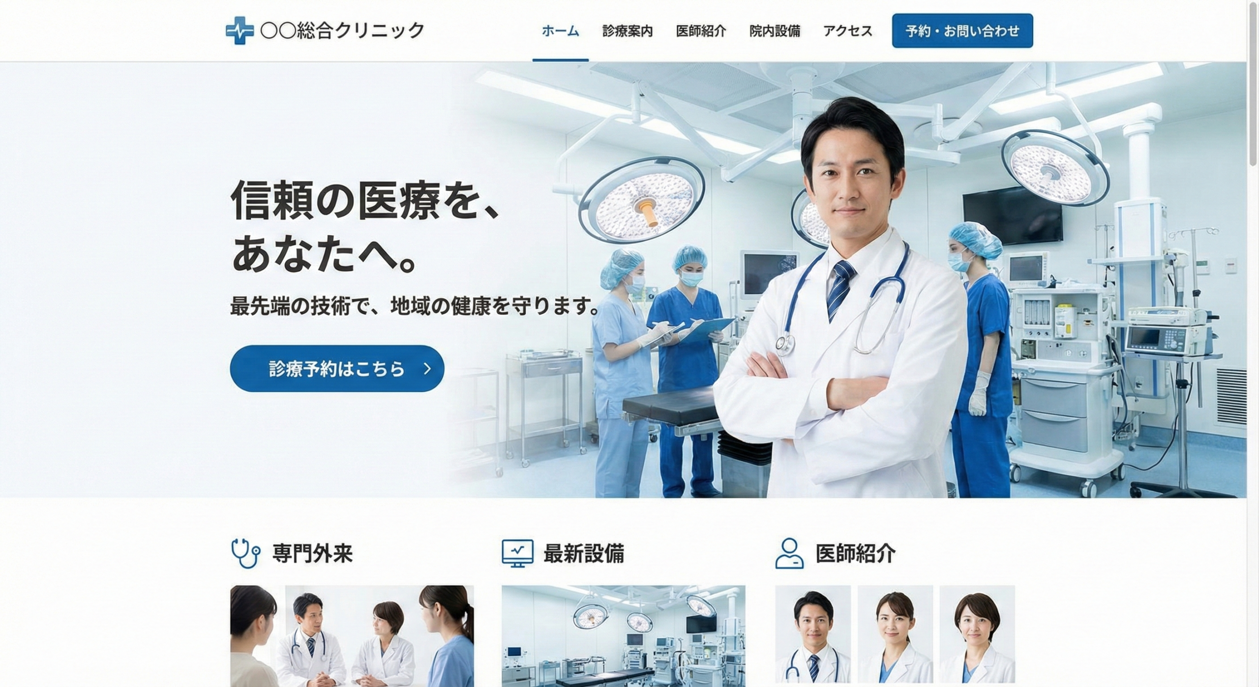 医療機関のWebサイトにおいて、最も重要な要素は「デザインの美しさ」ではなく「情報の正確性と信頼感」です。患者様は体の不調や不安を抱えて検索するため、迷わせない・待たせない・不安にさせないUI(ユーザーインターフェース)を徹底しました。 白衣を連想させる清潔な「白」と、冷静な判断力を示す「青」を基調に、高度な医療技術と地域密着の温かさを融合。「ここなら安心して体を任せられる」という確信を、来院前の段階で醸成するデザインです。