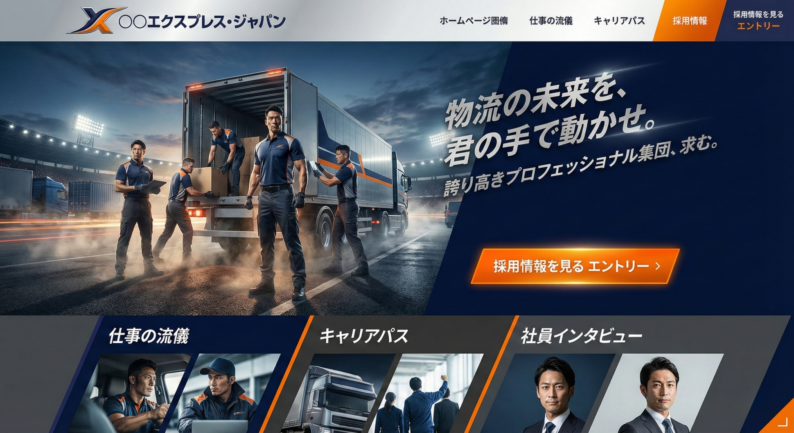 • 色彩心理: ベースカラーの深いネイビーは、物流企業に不可欠な「規律」「安全性」「誠実さ」を象徴します。